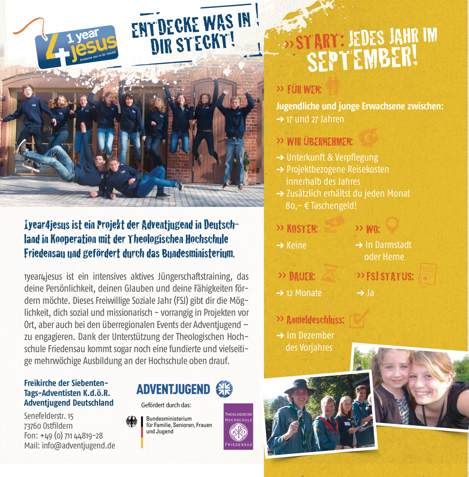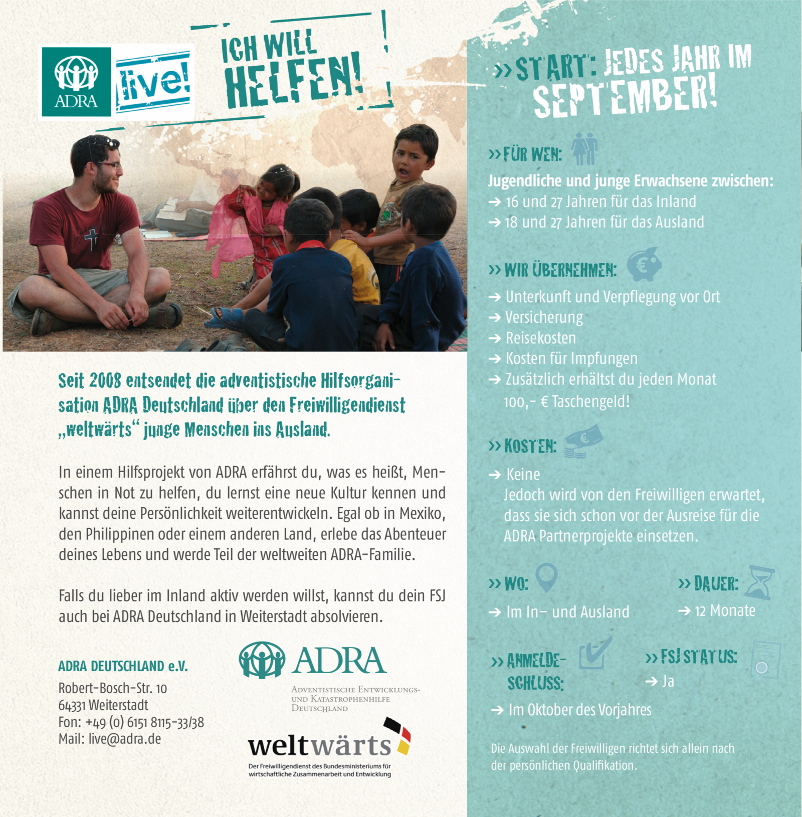 Die Freiwilligendienste 1year4jesus, ADRA live! und adventist youth service bieten jungen Menschen die Möglichkeit, an sozial ausgerichteten Projekten auf der ganzen Welt teilzunehmen. Hier könnt ihr euch einen Überblick über Inhalte, Kosten, Anmeldeschluss etc. verschaffen.