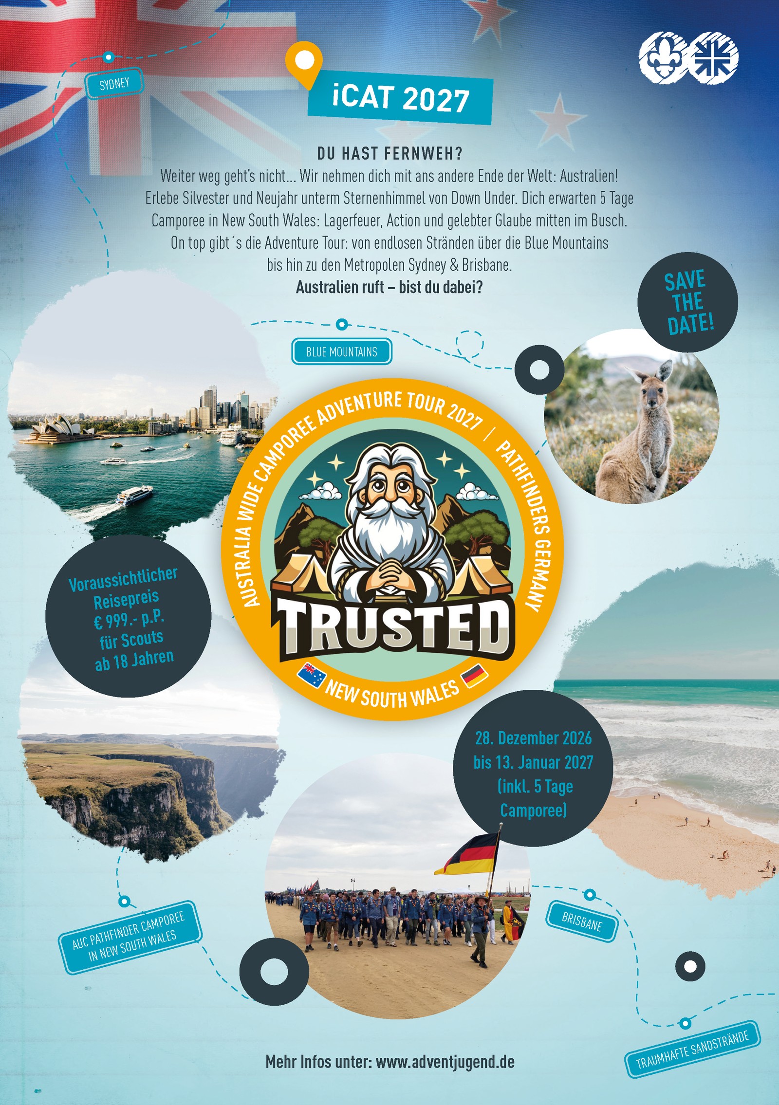 Du träumst davon, die Welt zu entdecken – und das am liebsten mit anderen PfadfinderInnen? Dann ist iCAT Australien genau dein Abenteuer! Vom 28. Dezember 2026 bis zum 13. Januar 2027 nehmen wir dich mit ans andere Ende der Welt – nach Australien! Zusammen mit rund 50 PfadfinderInnen aus Deutschland machst du dich auf zu einer Reise voller unvergesslicher Erlebnisse, Naturwunder, Begegnungen und Gemeinschaft.