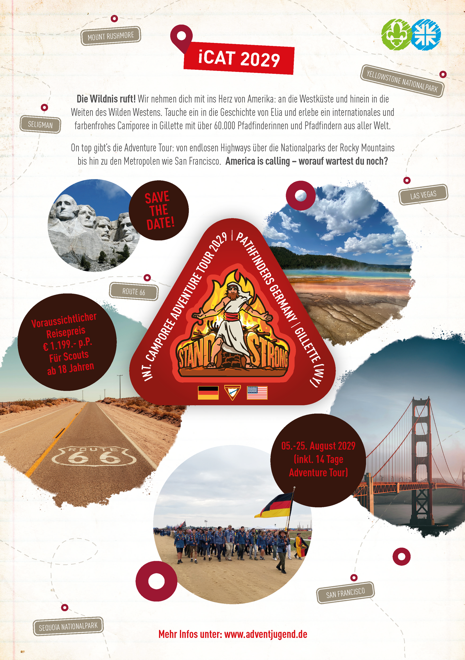 60.000 Pfadfinder aus über 65 Ländern werden beim internationalen Camporee vom 06.-12. August 2029 in Gillette (WY), Amerika erwartet. Sei du einer davon, der sich begeistern lässt von der beeindruckenden Umsetzung des Mottos „Stand Strong“, durch das wir die biblische Geschichte des Propheten Elias erleben werden! Besuche einen der unzähligen Workshops und tauche ein in das weltweite Pfadfinderleben! Entdecke auf der anschließenden